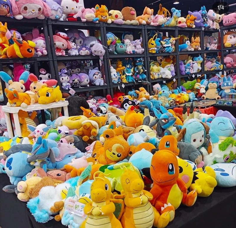 Plushies, enamel pins, plush bags, stickers, charms