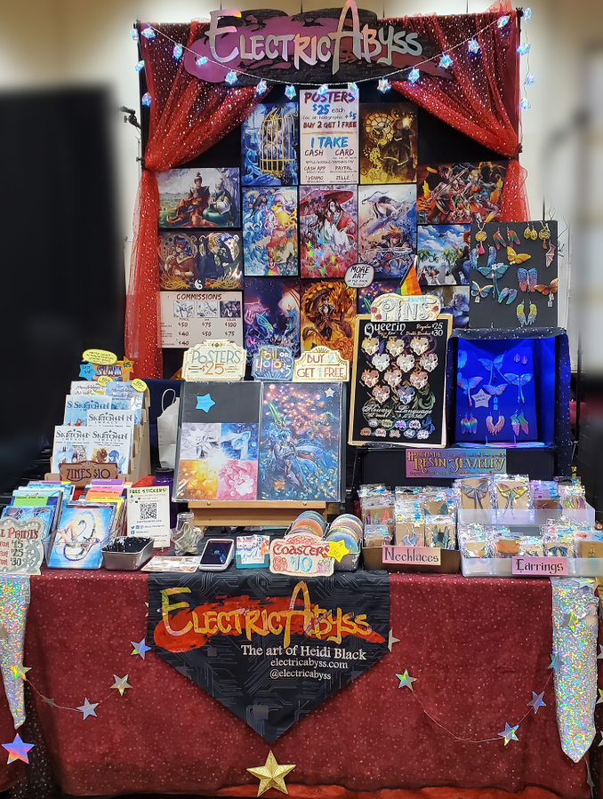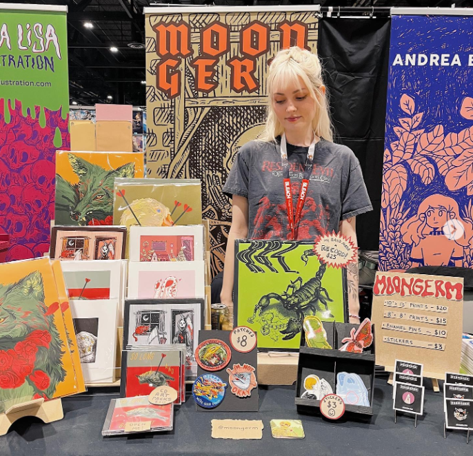 prints/posters, resin jewelry, comics, zines, enamel pins