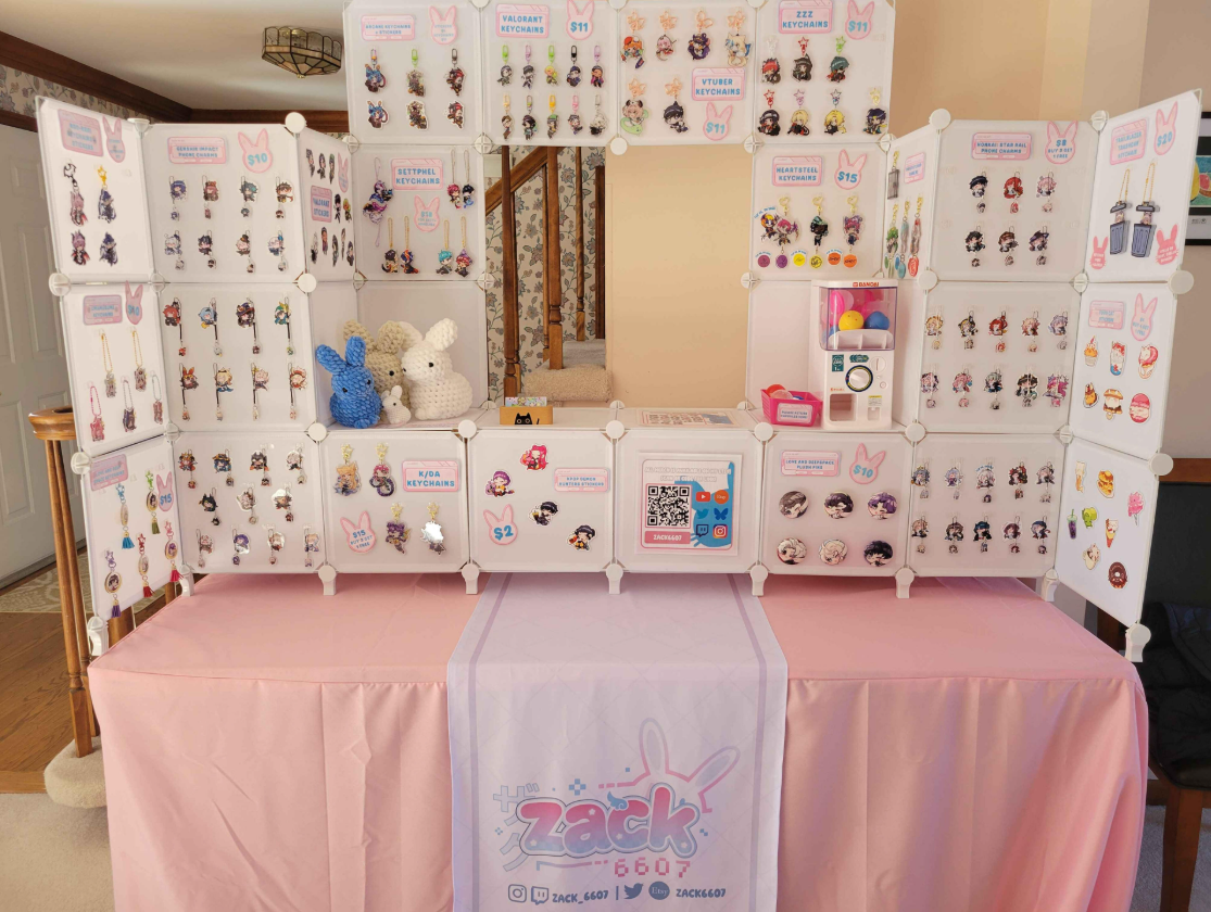 Acrylic Keychains, Art Prints, Acrylic and Enamel Pins, Standees, Buttons, Stickers, Lanyards and Stationary mostly with more product types in the works