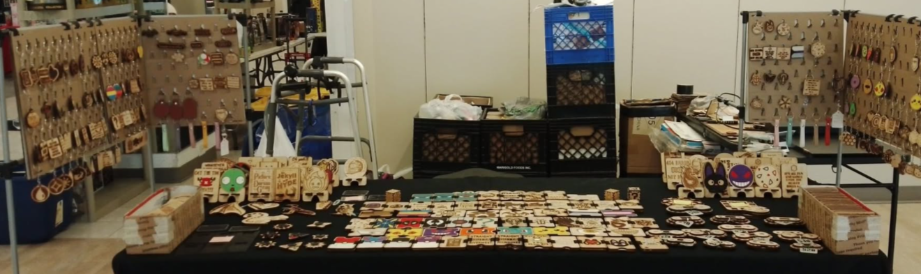 Wallets, phone stands, keychains, dice trays, dice jails, pins, badge holders, coastwrs, bottle openers, knitting/crocheting accessories.